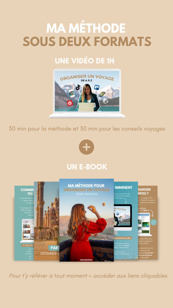 Si tu ne sais pas par où commencer pour organiser ton voyage et trouver les meilleurs bons plans, je t’ai créé un GUIDE ORGANISATION VOYAGE avec ma méthode pour organiser un voyage étape par étape, et j’y ai glissé tous mes conseils voyage, je te laisse checker ça :