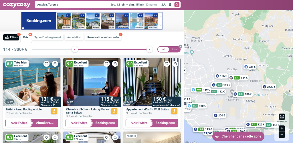 Cozycozy c’est une app (ou un site) qui compare toutes les plateformes d’hébergement au même endroit. Tu y trouveras les hotels mais aussi les appartements et villas puisqu’il compare tous les sites connus comme booking.com, All.com, Airbnb, Abritel etc